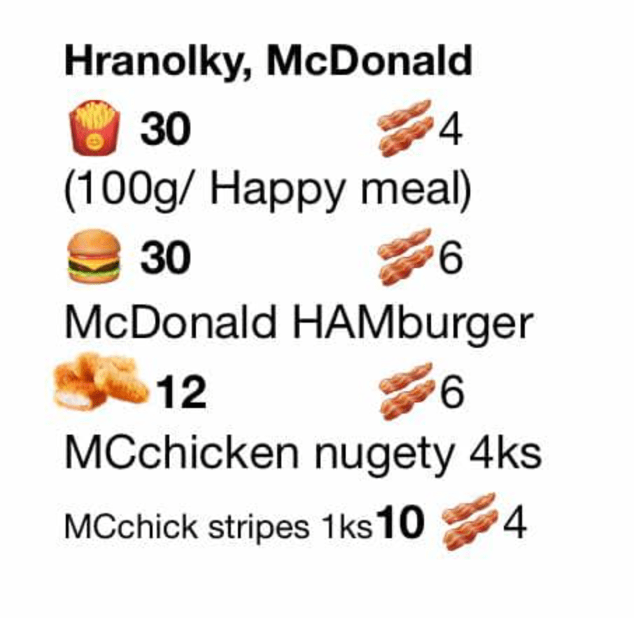 For the cards, it’s easiest to use emojis; for children are easy-peasy. The number next to bacon represents additional carbohydrates from fats and proteins (fat-protein units). I found the widely used calculation formula to work for us: 30% of total fats + proteins – fiber. You should know or consult with your diabetologist about fat-protein units. The bold number represents the number of grams of carbohydrates.